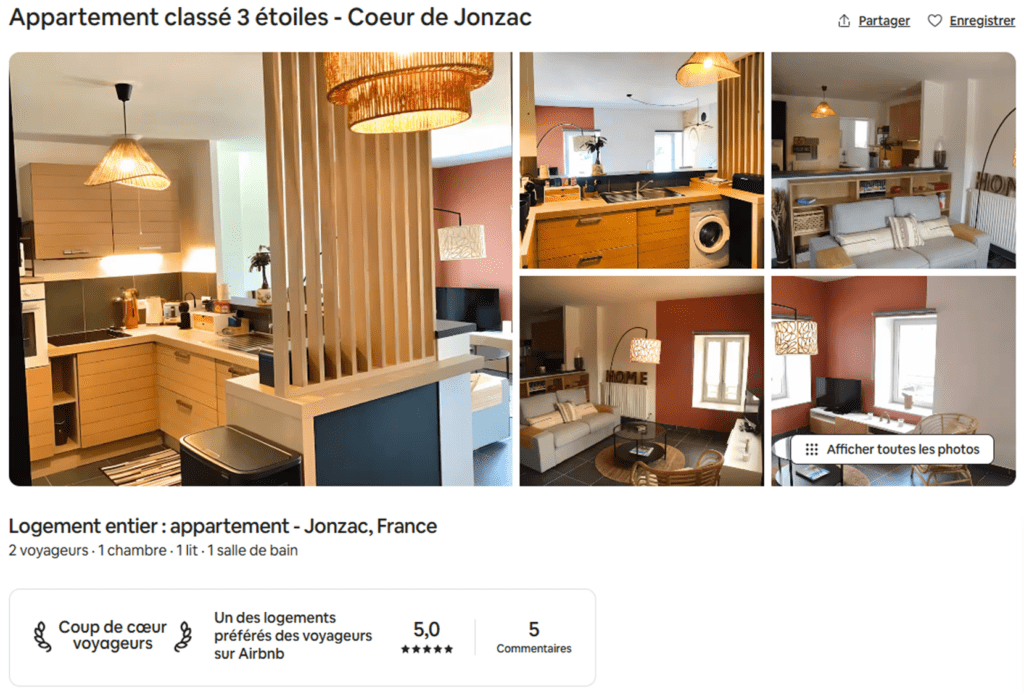 - Le résultat : Un bien classé 3 étoiles qui affiche une note de 5/5 sur Airbnb avec la distinction « Coup de cœur voyageurs ».