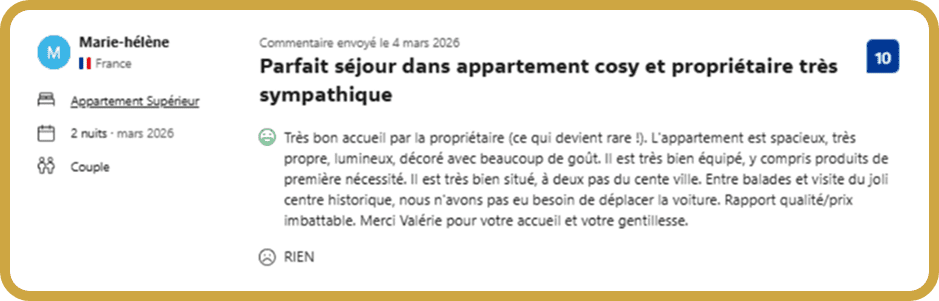 - L’impact : Les voyageurs se sentent attendus et conseillés comme des invités privilégiés. Cette attention se traduit par une note de 10/10 pour la situation géographique et l’expérience globale sur les plateformes.